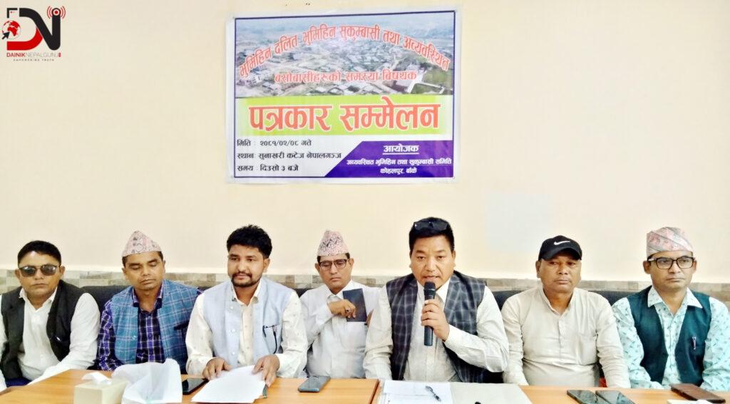 मंगलबार नेपालगन्जमा पत्रकार सम्मेलनको आयोजना गरेर अव्यवस्थित भूमिहीन तथा सुकुम्बासी समितिले कोहलपुर नगरपालिका एकतर्फी रूपमा दुई दशकदेखि बसिरहेकाहरूलाई विकल्प विना हटाउने प्रयास गरिरहेको आरोप लगाएको छ । ‘भूमिहीनका सम्बन्धमा रहेका मापदण्डहरू अनुसार अगाडि बढ्दा समस्या समाधान हुन्छ, तर बसिरहेकाहरूलाई जबर्जस्ती हटाउने प्रयास भैरहेको छ’, पत्रकार सम्मेलनमा सहभागीहरूले भने, ‘जबर्जस्ती हटाए हामी कहाँ जाने ?’