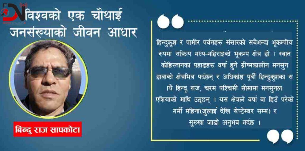 ५ फरवरी २०२४ को द इन्डियन एक्सप्रेसले पनि हिन्दुकुश हिमालयलाई एशियाको पानीको टावर भनेको छ किनभने तिनीहरू १० प्रमुख नदीहरूको स्रोत हुन् र दुई ध्रुवहरू बाहिर सबैभन्दा ठूलो हिउँ र बरफ भण्डारहरू छन् । हिन्दुकुश हिमालयबाट निस्कने पानीले २ अरब ३० करोड मानिसहरूलाई खाना, ऊर्जा र इकोसिस्टम सेवाहरू प्रदान गर्दछ । यसले जलवायु परिवर्तन र सामाजिक–आर्थिक तथा जनसांख्यिकीय परिवर्तनमा अभूतपूर्व प्रभाव पार्दछ ।