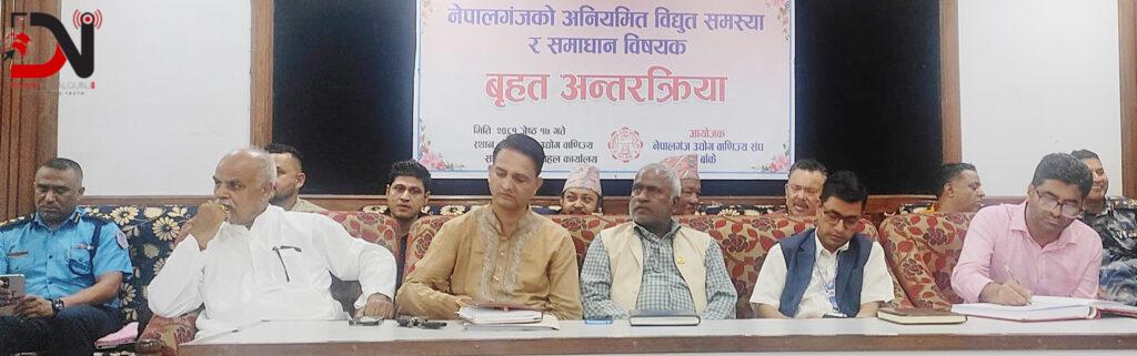 नेपालगन्ज उद्योग वाणिज्य संघका महासचिव भीम बहादुर रानाभाटले सञ्चालन गरेको कार्यक्रममा संघका अध्यक्ष टंक बहादुर धामीले संघले प्रत्येक बर्ष विद्युत समस्या समाधानका लागि जिल्ला देखि केन्द्रसम्म पहल गरेको बताए । उनले चर्को जरिवाना असुल्ने विद्युत प्राधिकरणले नियमित विद्युत नदिंदा उद्योगी, व्यवसायीले नोक्सानी व्यहोरिरहेको बताए ।