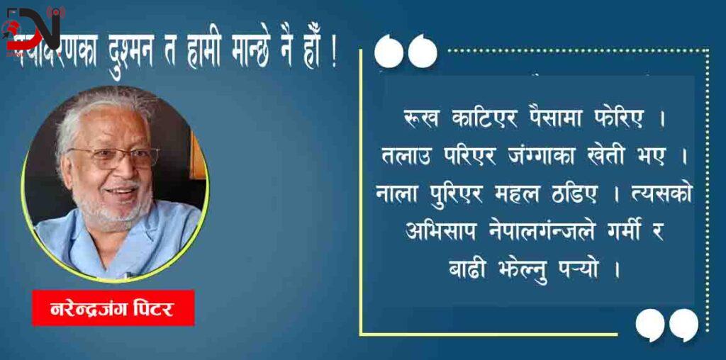 रुख काटिएर पैसामा फेरिए । तलाउ परिएर जंग्गाका खेती भए । नाला पुरिएर महल ठडिए । त्यसको अभिसाप नेपालगंन्जले गर्मी र बाढी झेल्नु प¥योे ।