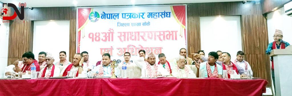 नेपाल पत्रकार महासंघ बाँकेको १४औं बार्षिक साधारणसभा तथा अधिवेशन शनिबार आयोजना भएको छ । केन्द्र, प्रदेश र जिल्लामा एकैसाथ शनिबार हुने पूर्वनिर्धारित निर्वाचन प्रक्रिया अगाडि नबढेपनि बाँकेको साधारणसभा सम्पन्न भएको हो । जेठ २६ गतेबाट सुरु हुने पूर्वनिर्धारित कार्यक्रम सदस्यता विवादका कारण स्थगित भएको जानकारी महासंघका केन्द्रीय अध्यक्ष विपुल पोखरेलले शुक्रबार साँझ सार्वजनिक गरेका थिए ।