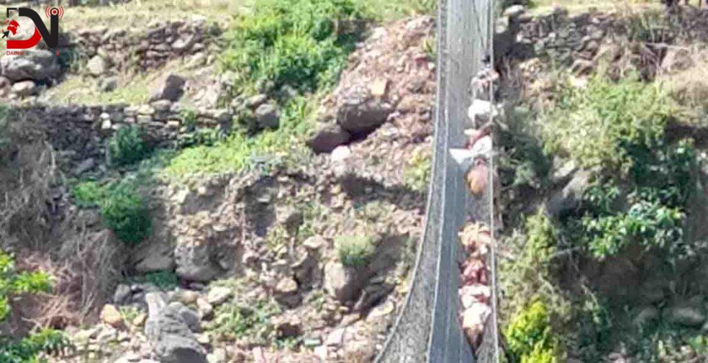 कर्णाली नदीमा रहेको झोलुङ्गे पुलको जाली लत्रिँदा बीच भागमै अड्किएका ११ खच्चडको जीवितै उद्धार गरिएको छ । दुई खच्चडको भने मृत्यु भएको छ । अछामको पञ्चदेवल बिनायक नगरपालिका–९ कालेकाडा र दैलेखको आठबिस नगरपालिका–६ खिड्कीजिउला जोडने झोलुङ्गे पुलको जाली लत्रिएपछि आज बिहानदेखि १३ खच्चड पुलको बीच भागमा अड्किएका थिए । खच्चडलाई पुलको जाली काटेर कर्णालीमा खसाली उद्धार गरिएको अछामका प्रहरी नायव उपरीक्षक सन्तोष पाठकले जानकारी दिनुभयो । “पुलको जाली काटेर उद्धार गर्ने क्रममा दुई खच्चडको मृत्यु भएको हो”, उहाँले भन्नुभयो–“बाँकीको डुङ्गाको सहायताले जीवितै उद्धार गर्न सफल भयौँ ।” पुलको दाँहिने तर्फको जाली लत्रिएको थियो । खट्टा जालीभित्र पसेपछि खच्चड पुलमा अड्किएका थिए । पुलको दाँहिने तर्फको भाग पुरै बाङ्गो भएको छ । उद्धारमा अछामस्थित नेपाली सेनाको गोरख बक्स गणको टोली, नेपाल प्रहरी, सशस्त्र प्रहरी बल तथा स्थानीयवासी खटिएका थिए ।