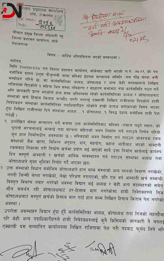 दारुल उलुम फैजुन्नबी जामा मस्जिद ईदगाह सञ्चालक समितिका अध्यक्ष र कोषाध्यक्ष विरुद्ध आर्थिक अनियमितताको दाबी सहित जिल्ला प्रशासन कार्यालय बाँकेमा उजुरी परेको छ ।