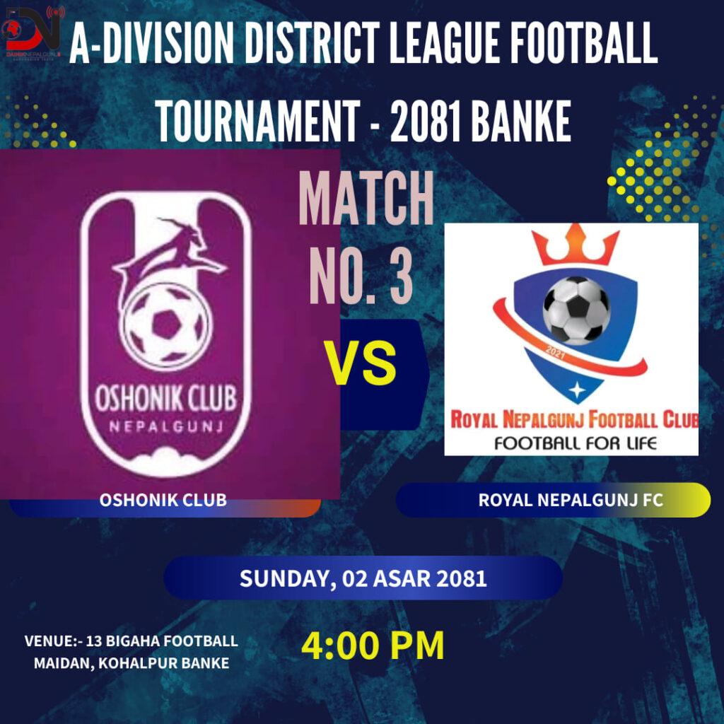 कोहलपुर स्थित १३ विगाहा फुटबल मैदानमा भएको खेलमा रोयलले ओशोनिक क्लबलाई २–० ले पराजित गरेको छ । रोयलका लागि सुमित थापाले २ गोल गरे । उनले खेलको ८औं र ५०औं मिनेटमा गोल गरेका थिए । खेलमा रोयलका अविशेख यादव प्लेयर अफ द म्याचबाट पुरस्कृत भए ।