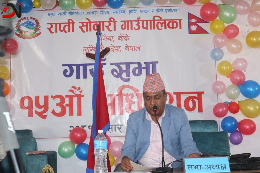 बाँकेको राप्तीसोनारी गाउँपालिकाले गाउँसभाको पन्ध्रौ अधिवेशनमा नीति तथा कार्यक्रम र बजेट प्रस्तुत गरेको छ । गाउँपालिकाका अध्यक्ष तप्तबहादुर पौडेलले आगामी आर्थिक वर्ष २०८१-०८२ को नीति तथा कार्यक्रम र उपाध्यक्ष मनिषा सिंह थारुले बजेट तथा कार्यक्रम प्रस्ततु गरिन् । राप्तीसोनारीले आगामी बजेट करिव ८६ करोड विनियोजन गरेको छ । यो चालू आर्थिक वर्षको भन्दा झन्डै तीन करोडले कम हो ।