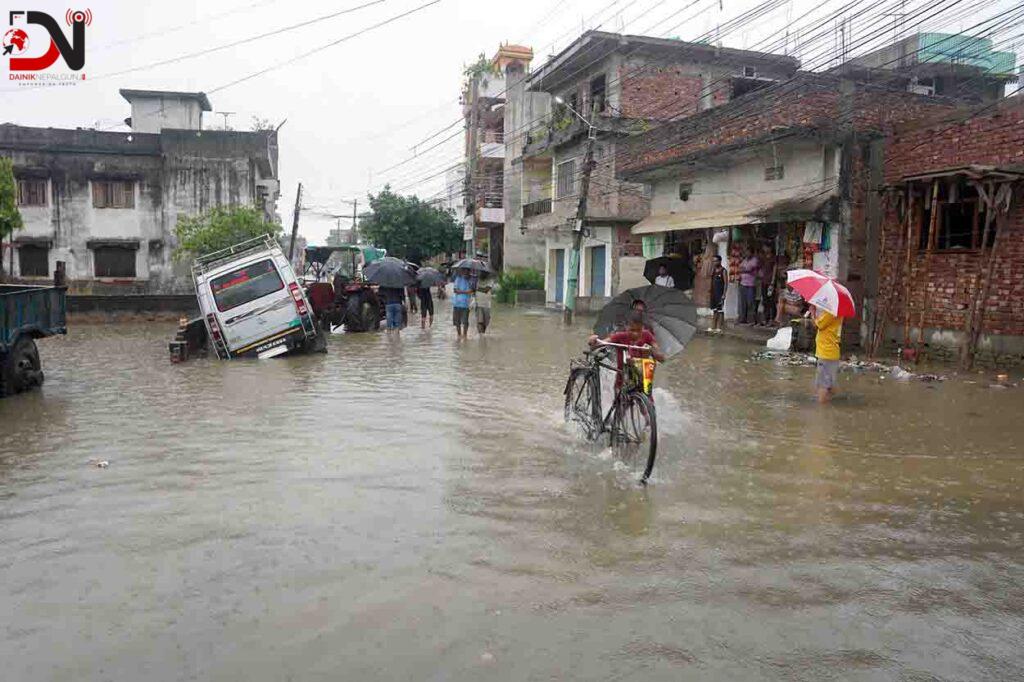 घोराही–तुलसीपुर सडक सडक अबरुद्ध तुलसीपुर (दाङ) : दाङको घोराही–तुलसीपुर सडकखण्ड अन्तर्गत सेवारखोलामा बनाएको डाइभर्सन बगेको छ । बाढीले आज बिहान उक्त डाइभर्सन बगाएको हो । सो ठाउँमा असहले आवतजावत ठप्प छ । जिल्ला प्रशासन कार्यालय दाङले वैकल्पिक सडक प्रयोग गर्न अनुरोध गरेको छ । घोराही उपमहानगरपालिका–१६ सेवारखोलामा चार लेनको पक्की पुल अधुरै छ । बाढीले वीरगन्जको विभिन्न ठाउँ डुबानमा पर्सा : गए रातिदेखि लगातार परेको वर्षाले पर्साको वीरगन्ज महानगरपालिकाका विभिन्न वडा डुबानमा परेका छन् । महानगरपालिकाको छपकैया, बजारछपकैया, घडिअर्वा, रानीघाट, श्रीपुर, नगवा, राधेमाईलगायत ठाउँ डुबानमा परेका छन् । पानी सडकमै जम्मा भएर स्थानीयको घर भित्र पस्न थालेको छ । जमेको पानीलाई निकास दिन बिहानैदेखि उपकरण तथा कर्मचारी परिचान गरिएको वीरगन्ज महानगरपालिकाको सरसफाई शाखाका प्रमुख सरफुद्दिन मियाले जानकारी दिनुभयो । डुबान भएका क्षेत्रमा नाला सफा गर्ने काम भइरहेको छ । वर्षा भएपछि यहाँका किसान खुसी भएका छन् । पानी परेपछि रोपाइँ गर्न पाइने आशले उनीहरु खुसी भएका हुन् । पर्सामा कुल ५४ हजार पाँच सय हेक्टर खेतियोग्य जग्गा रहेको छ । यसमध्ये ४७ हजार हेक्टरमा धान खेती हुने गरेको छ ।