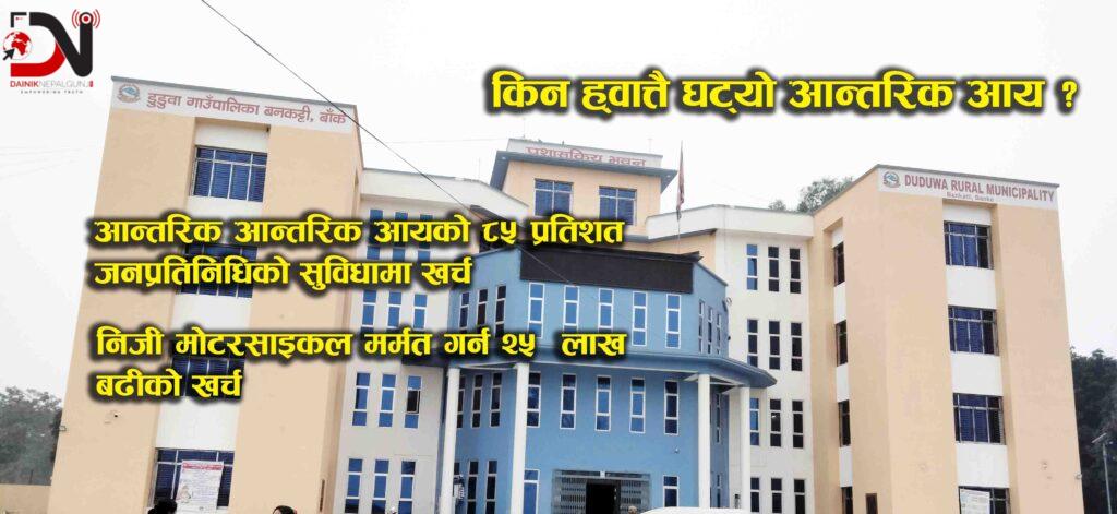 आन्तरिक आयको ठूलो हिस्सा पालिकाले जनप्रतिनिधिको सुविधामै खर्च गरेको छ । पालिकाको आन्तरिक आय रु. ८९ लाख ५७ हजार हजार रहेकोमा आर्थिक बर्ष २०७९÷८० मा पदाधिकारीको सुविधामा मात्रै ७६ लाख ५० हजार डुडुवा गाउँपालिकाले खर्च गरेको हो । पदाधिकारी सुविधामा खर्च भएको रकम कुल आन्तरिक आयको ८५ प्रतिशत रहेको छ ।