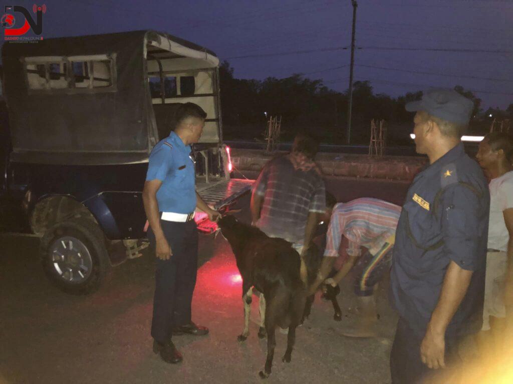 पशु ढुवानी मापदण्ड २०६४ विपरित ढुवानी गरिएका खसिलाई ईलाका प्रहरी कार्यालय धनौली खजुराको टोलीले चेकजाँचको क्रममा बरामद गरेको हो । बा ५ ख १४११ नम्बरको बसको डिक्कीमा कोचाकोच गरी ढुवानी गर्दा ४ खसी गर्मीले निस्सासिएरै मरेका थिए ।