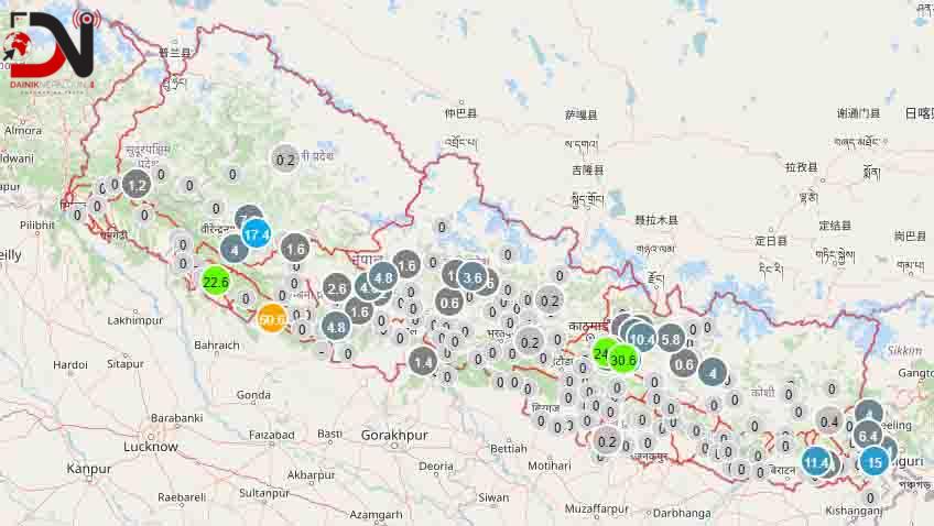 देशभर साधारणतया बदली रही गण्डकी, कोशी, बागमती, गण्डकी, लुम्बिनी र कर्णाली प्रदेशका एक–दुई स्थानहरुमा हल्कादेखि मध्यम वर्षा भइरहेको छ । बागमती तथा लुम्बिनी प्रदेशका केही भेगमा भारी वर्षा भइरहेको छ ।
