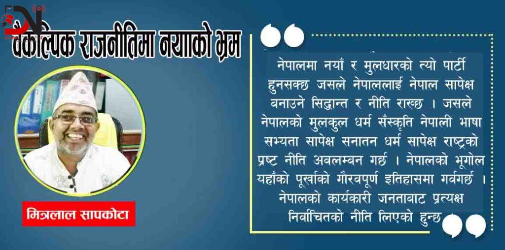 नेपाली राजनीतिमा आजसम्म जतिपनि पार्टीहरु उदाएका छन उनीहरु कोहिपनि वैकल्पिक छैनन् । सबै एक अर्काका खानापूर्ति गर्ने परिपूरक मात्रै रहेका देखिएका छन् । सबैको समाजवादप्रति मोह छ । सबैको विदेश सापेक्ष र नेपाल निरपेक्षतामा विश्वास छ । नेपाललाई अविकसित भन्ने, नेपाली मुलकुल धर्म सँस्कृति र सभ्यतालाई पाखण्ड भन्ने सोच व्यवहार छ । यहाँ नयाँ भनिने हुन या वैकल्पिक भनिने सबैका आर्दश आजसम्म नेपाल निर्माता बन्न सकेका छैनन् । नेपालसँग कुनै साइनो नभएको र नेपालको लागि कुनै योगदान नरहेको उहि माक्र्स, लेनिन, माओ, गान्धी लोहियाहरु नै उनीहरुका आर्दश व्यक्ति रहेका छन् । उहि पश्चिमा उदारवाद, भ्याटिकनवाद, जर्ज सोरोसवाद, अमेरिकी सम्म्राज्यवाद, यूरोपियन जुडोइनवाद, भारतीय साँधीढुङ्गो सारवाद, हेपाहा मिचाहावाद, इसाइमुसाइवाद प्रिय रहेको कुनैपनि पार्टी नेपालको लागि न नयाँ हो न वैकल्पिक हो भन्न कुनै हिच्किचाउनु पर्ने आवश्यकता नै छैन । निर्धक्क भन्न मिल्छ ।