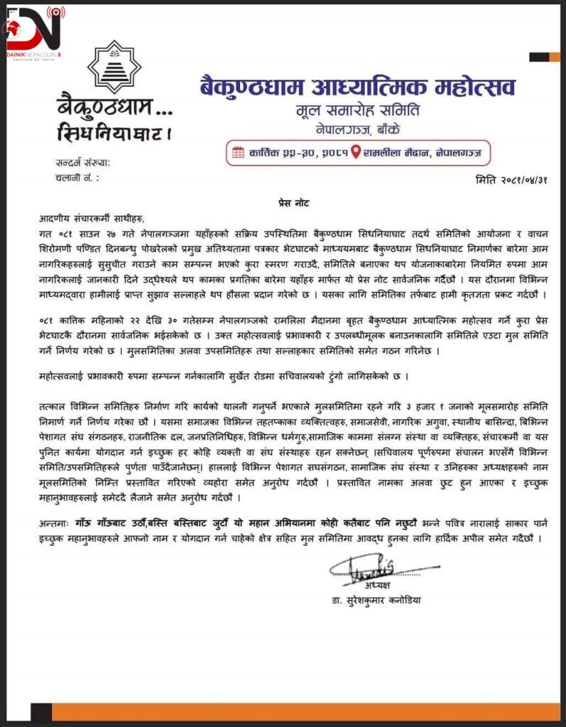 बैकुण्ठधाम संस्थाका अध्यक्ष डाक्टर सुरेश कुमार कनोडियाले बिहीबार प्रेस विज्ञप्ति जारी गरी महोत्सवका लागि आयोजक मूल समारोह समिति गठन गरिएको जानकारी दिए । उनका अनुसार, ३ हजार १ जनाको मूल समारोह समिति निर्माण गर्ने निर्णयसँगै विभिन्न उपसमिति गठनका लागि स्वयं अग्रसरताको आव्हान गरिएको छ ।