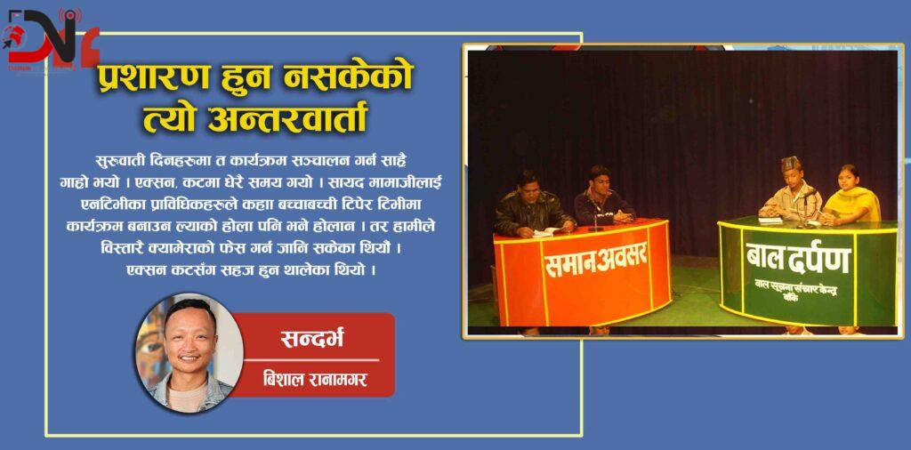 त्यस बेला हामीले तयार गरि प्रशारण गरेको बाल दर्पणका १६ वटा श्रृंखलाहरुमा अधिकारकर्मी तथा संसद सचिवालयका पूर्व सचिव गोपालनाथ योगी, हाल अमेरिकामा रहनुभएका बालकृष्ण जोशीलगायतका व्यक्तिहरुले अन्र्तवार्ता दिनुभएको थियो ।