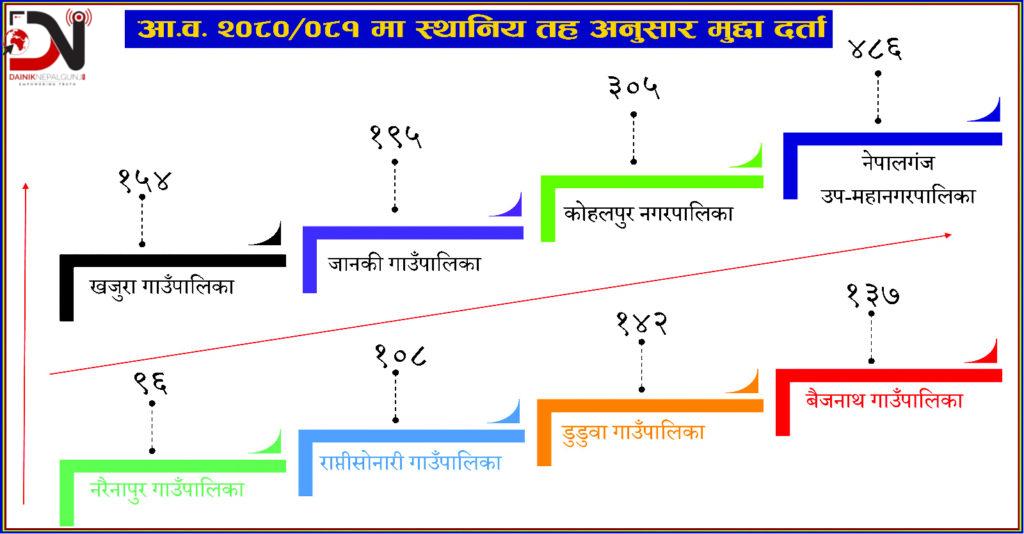 बाँके प्रहरी प्रवक्ता, प्रहरी नायब उपरीक्षक नारायण डाँगका अनुसार खजुरा गाउँपालिका क्षेत्रका १ सय ५४, जानकी गाउँपालिकाका १ सय ९५, कोहलपुर नगरपालिकाका ३ सय ५, राप्तीसोनारी गाउँपालिकाका १ सय ८, डुडुवा गाउँपालिकाका १ सय ४२, बैजनाथ गाउँपालिकाका १ सय ३७ मुद्दा दर्ता भएका छन् ।