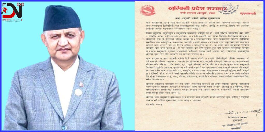 लुम्बिनी प्रदेशका मुख्यमन्त्री चेतनारायण आचार्यले थारु समुदायले मनाउने बर्का अट्वारी एक विशेष धार्मिक र सांस्कृतिक पर्व भएको बताउनु भएको छ । बर्का अट्वारी पर्वको अवसरमा शुभकामना व्यक्त गर्दै मुख्यमन्त्री आचार्यले यस पर्वले थारू समुदायको धर्म, संस्कृति, र परम्परालाई जोगाइराख्न महत्वपूर्ण भूमिका खेल्दै आएको बताउनु भएको हो ।