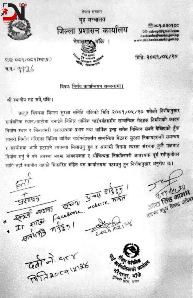 ‘प्रस्तुत विषयमा जिल्ला सुरक्षा समिति बाँकेको मिति २०८१÷०५÷२० गतेको निर्णयानुसार सार्वजनिक स्थान÷बाटोमा बनाइने विभिन्न धार्मिक चार्डपर्वहरूसँग सम्बन्धित गेटहरू निर्माणको कारण निर्माण स्थल र जिल्लाभरी नकारात्मक प्रभाव तथा धार्मिक द्वन्द्व समेत निम्तिन सक्ने देखिएको हुँदा त्यसरी निर्माण गरिएका विभिन्न धार्मिक चार्डपर्वहरूसँग सम्बन्धित गेटहरू सुरक्षा निकायहरूको समन्वय र सहयोगमा आजै हटाउने व्यवस्था मिलाउनु हुन र आगामी दिनमा त्यस्ता संरचना कुनै पक्षबाट निर्माण गर्नु नै पर्ने अवस्था भएमा आवश्यकता र औचित्यता निक्र्योलगरी आवश्यक पूर्व स्वीकृतीका लागि त्यहाँ स्थानीय तहको सिफारिस सहित यस कार्यालयमा पठाउनु हुन निर्णयानुसार अनुरोध छ’, प्रशासनले बाँकेका सबै स्थानीय तहलाई सम्बोधन गरेले लेखेको पत्रमा उल्लेख छ ।