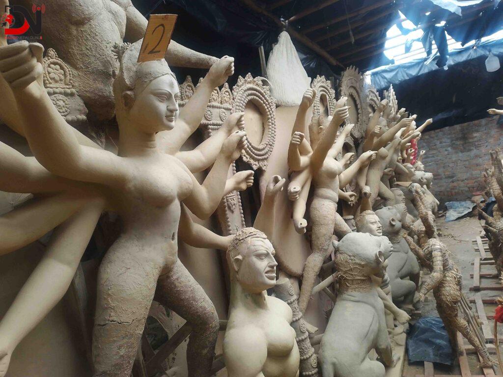 दसैँ आउन महिना दिन बाँकी छँदै नेपालगञ्ज उपमहानगरपालिका–८ निवासी मूर्तिकार छोटु केवटलाई दुर्गाभवानीका मूर्ति बनाउन भ्याइनभ्याइ छ । नगर भवन नजिकै अस्थायी टहरा निर्माण गरेर छोटुले मुर्ति बनाउने काम गर्दै आउनुभएको छ । घटस्थापनाको दिनसम्म अर्डर पाएका सबै मुर्ति तयार गरिसक्नुपर्ने भएकाले यतिबेला दिनरात काम भइरहेको उहाँले बताउनुभयो । “चौध–पन्ध्र जति मुर्ति तयारी अवस्थामा छन्, रङ्रोङ्गन गर्नमात्रै बाँकी छ, अरु त्यत्ति तयारी हुँदैछ, अहिले कामले भ्याइनभ्याइ छ”, छोटुले भन्नुभयो, “आजभोली मुर्ति किन्न भारत जानु पर्दैन नेपालगञ्जमै ठाउँ–ठाउँमा बन्ने गरेका छन् ।”+