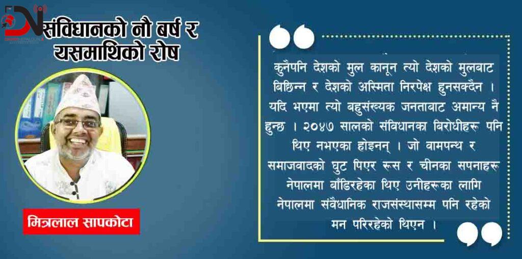 हिजो असोज ३ गते, देशले संविधान दिवस मनायो । ‘सार्वभौम नेपालीले आफ्नो विवेकले आफ्नो निर्णयले बनाएको र संविधान सभाले जारी गरेको’ नेपालको संविधान २०७२ को दशौं बार्षिकी नेपालका सबै तहका सरकारहरुले संविधानप्रति रोष प्रकट गर्नेहरुलाई निगरानी र नाकाबन्दी गरेर औपचारिक रुपमा मनाए । नेपाली जनताले संविधान जारी मिति देखि नै उतिसारो उत्साह र उमङ्गका साथ मनाउने गरेका छैनन् । यसमाथि ठूलो जनसंख्याको रोष हरेक बर्ष बढिरहेको छ । हिजो पनि तराई लगायत कतिपय ठाउँहरुमा यस दिनलाई कालो दिनको रुपमा मनाइयो । अधिकाशं सचेत नेपाली जो नेपाललाई माया गर्छन्, नेपालको मुल कुल धर्म सँस्कृति, नेपाली भाषा, मौलिक सभ्यता र सिङ्गो नेपाली अस्मितामा गर्व गर्नेहरुले यो संविधानलाई आजपनि डि फ्याक्टो को रुपमा मात्रै मान्ने गरेका छन् । उनीहरुको लागि यो संविधानलाई आफ्नो संविधान भनेर नै स्वीकार गरेको अवस्था पनि छैन । यति हुँदाहुँदै पनि यो संविधान नेपालको वर्तमान मूल कानून हो यो सत्य हो ।