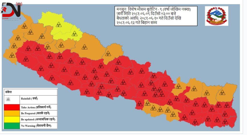 असोज १२ गते (शनिबार) देशभर साधारणतयादेखि पूर्णतया बदली रही देशका अधिकांश स्थानहरू हल्कादेखि मध्यम वर्षाको सम्भावना रहेको र बागमती प्रदेशका, गण्डकी प्रदेश, लुम्बिनी प्रदेश तथा कर्णाली प्रदेशका केही स्थानहरू र बाँकी प्रदेशका थोरै स्थानहरूमा मेघ गर्जन÷चट्याङ्ग सहित भारीदेखि धेरै भारी वर्षाको समेत सम्भावना रहेको छ । साथै देशका लुम्बिनी प्रदेश, गण्डकी प्रदेश तथा कर्णाली प्रदेशका केही स्थानहरूमा हावाहुरीको समेत सम्भावना रहेको महाशाखाले जानकारी दिएको छ । असोज १३ गते (आइतबार) देशभर आंशिकदेखि साधारणतया बदली रही देशभर हल्कादेखि मध्यम वर्षाको सम्भावना रहेको र गण्डकी प्रदेश, लुम्बिनी प्रदेश र कर्णाली प्रदेशका एक–दुई स्थानमा मेघ गर्जन/चट्याङ्गसहित भारी वर्षाको सम्भावना रहेको जनाइएको छ ।