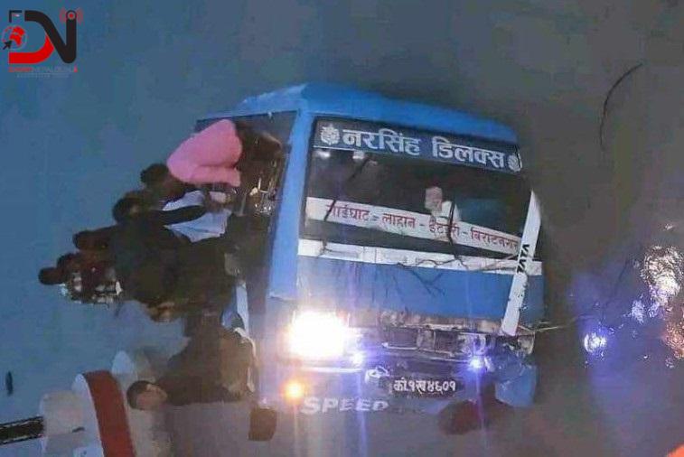 कोसी ब्यारेजको ३४–३६ नम्बर ढोकाको बीचबाट सप्तकोसी नदीमा बस खसेको छ । बिराटनगरबाट गाईघाट जाँदै गरेको को १ ख ४६०१ नम्बरको बस ब्यारेजबाट सप्तकोसी नदीमा खसेको सुनसरीका प्रहरी नायब उपरीक्षक नवीनकृष्ण भण्डारीले जानकारी दिनुभयो ।