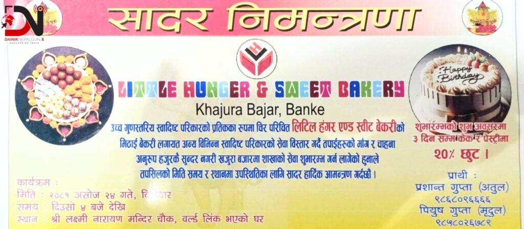 लिटिङ्ग हंगरका प्रोपराइटर पियुष गुप्ताका अनुसार, कोहलपुरको सफल व्यवसायिक मिठाइ तथा केक एण्ड बेकरीको शाखा पछि खजुरामा पनि आज बिहीबारदेखि शाखा सञ्चालनमा ल्याउन लागिएको हो ।