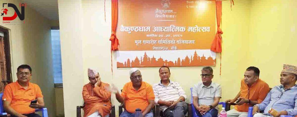 ‘बैकुण्ठधाम सिधनियाघाटको योजनालाई सार्थक बनाउन आयोजना गर्न लागिएको बैकुण्ठधाम आध्यात्मिक महोत्सवको सम्पूर्ण तयारी पूरा भएको छ’, नेपालगन्जको रामलीला मैदानमा आध्यात्मिक महोत्सव आयोजना हुने जानकारी दिंदै पत्रकार सम्मेलनमा संयोजक डा. सुरेशकुमार कनोडियाले भने, ‘कार्तिक ३० गतेसम्म सञ्चालन हुने महोत्सव व्यवस्थित ढंगले सञ्चालन गर्न २ हजार बढी सदस्य रहेको मूल समिति र त्यस अन्तर्गत रहने १ सय १० बढी उपसमिति गठन गरिएको छ ।’