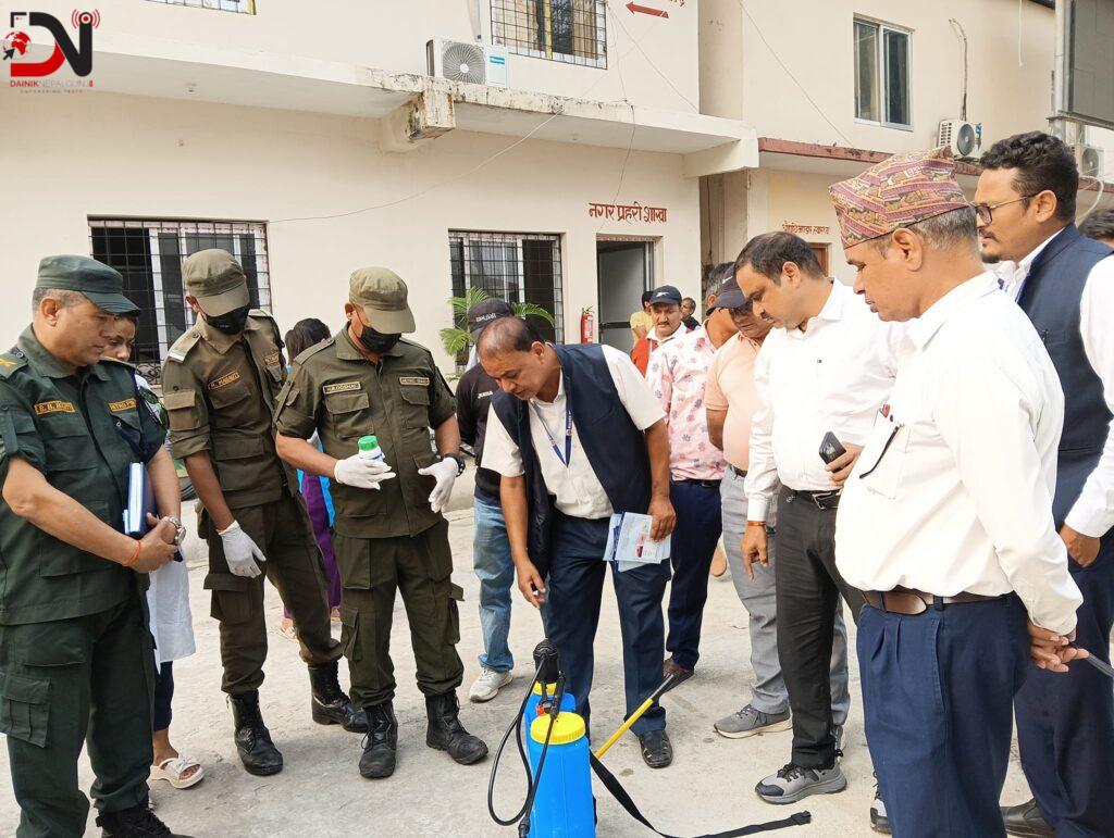 नगर प्रहरीलाई सबै वडाका पानी जम्ने स्थानहरूमा बायोपेस्टिसाइड छर्किने गरी परिचालन गरिएको नगर प्रमुख प्रशान्त विष्टले बताए । त्यसका लागि नगर प्रहरीलाई अभिमुखीकरण गरिएको छ । त्यसक्रममा नगर प्रमुख विष्टले प्रभावकारी ढंगले काम गर्न नगर प्रहरीलाई निर्देशन दिए । नगर प्रहरी युनिटमा नगर प्रहरी निरीक्षक सूर्यबहादुर बोगटीको कमाण्डमा ४२ जना छन् ।