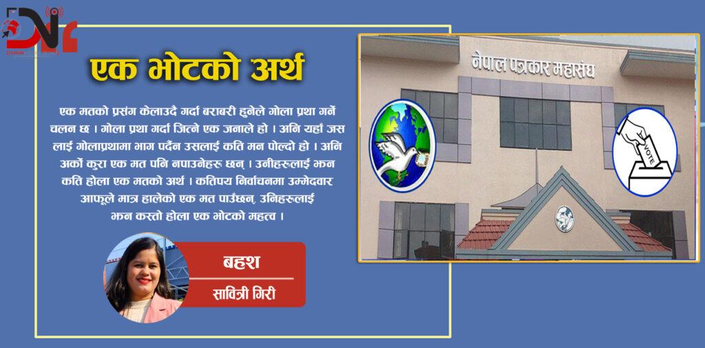म आफैपनि एक भोटको अर्थमा घेरिएर यहाँसम्म पुगेकी छु । नेपाल पत्रकार महासंघको शनिवार भएको निर्वाचनमा बाँके शाखाको महिला उपाध्यक्ष पदमा मेराविरुद्ध एक मत निर्णायक बन्यो । जित्नेको १०२ भोट आउँदा मेरो निर्णय १०१ भोटमा भयो । अंकगणितमा १ नपुग्दा म उपाध्यक्षको कुर्सीमा पुग्न सकिन । मलाई विश्वास नै थिएन श्रमजीवि पत्रकार चिन्नेहरू यतिधेरै हुनुहोला भन्ने । सबै पार्टीका झोले रहेनछन् भन्ने मेरो मत परिणामले देखाएको छ । त्यसैले एक भोटले चुनाव हार्दा पनि म खुसीनै छु ।