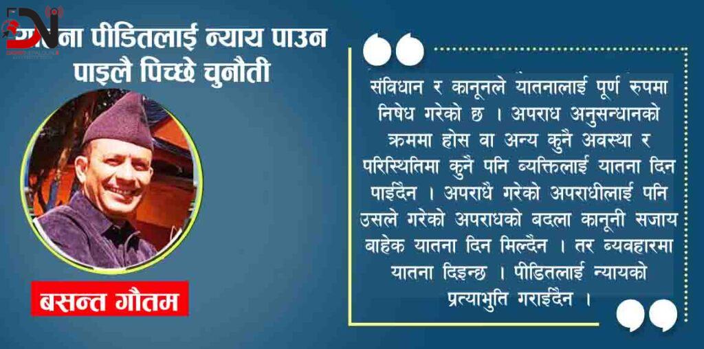 बर्तमान कानून अनुसार यातना फौजदारी अपराध हो । यातना अपराधजन्य मार्य मात्र नभएर गम्भीर मानव अधिकार उल्लघंनको घटना पनि हो । संविधान र कानूनले यातनालाई पूर्ण रूपमा निषेध गरेको छ । अपराध अनुसन्धानको क्रममा होस वा अन्य कुनै अवस्था र परिस्थितिमा कुनै पनि ब्यक्तिलाई यातना दिन पाईदैन । अपराधै गरेको अपराधीलाई पनि उसले गरेको अपराधको बदला कानूनी सजाय बाहेक यातना दिन मिल्दैन । तर ब्यवहारमा यातना दिइन्छ । पीडितलाई न्यायको प्रत्याभुति गराईदैन । कैयौ चुनौती र ब्यवधानका बिच न्यायका मार्ग पहिल्याएका यातना पीडितहरूले अदालतले पीडितका पक्षमा फैसला गरे पनि न्यायको अनुभुति गर्न पाउँदैनन् । यातना दिने पीडक कमै मात्रै कानूनको दायरामा आउछन् । यातनामा दण्डहिनता ब्याप्त छ । पीडितलाई न्याय पाउनै सकस छ । यस लेखमा प्रतिनिधिमुलक रूपमा उल्लेख गरिएका केही मुद्दाले पीडितलाई न्याय पाउन कति सकस छ, अदालतको आदेश बमोजिम क्षतिपूर्ति पाउन कति गाह्रो छ भन्ने प्रष्ट पार्दछ ।