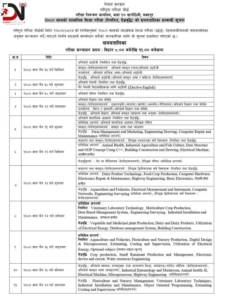 बाँके । परीक्षा नियन्त्रण कार्यालयले यस वर्षको माध्यमिक शिक्षा परीक्षा (एसईई) को मिति तोकेको छ । आउँदो चैत १५ देखि २७ गते एसईई परीक्षा सञ्चालन हुने परीक्षा नियन्त्रण कार्यालयले जनाएको छ ।