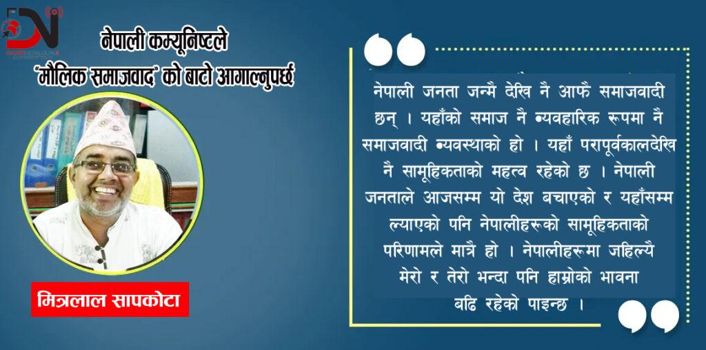 वास्तवमा नेपाली समाजमा परम्परा देखि नै चलि आएको समाजवादलाई नेपाली कम्यूनिष्टहरुले आफ्नो मूल आर्दश र सिद्धान्त बनाउन सक्नुपथ्र्यो । यसमा रहेका केहि समाजिक विभेदहरुलाई अन्त्य गर्दै, समाजमा रहेको वर्गीय असन्तुलनलाई सन्तुलित गर्ने समाजवादी उपायहरुको खोजी गरि यसलाई विकसित गर्दै जानुपर्ने थियो । नेपालको आफ्नो मौलिकतामा रहेको समाज विकासको सिद्धान्तलाई स्थितिगत्यात्मक तरिकाले अगाडी बढाउनु पर्ने थियो । समाजवादी ढाँचामा रहेका नेपालका संरचनाहरुलाई जर्गेना गर्नुपर्नेमा यसलाई भत्काएर नेपाली वामपन्थीहरुले नेपाली समाजको ढाँचा खल्बलाइसकेका छन् । यो उनीहरुको सबैभन्दा ठूलो र अक्षम्य भूल नै हो । नेपालमा कुनैपनि बीना वैयत्तिक सम्पत्तिको वाद चल्दैन । नेपालमा कुनैपनि नास्तिकवाद वा इसाइमुसाइवादको एकल निर्णय चल्दैन । नेपालमा राज्य भनेको राणा या पञ्चायत कालमा समेत नियमक र निर्णायक निकाय थियो तर पौरख गर्न रोक लगाउने र उद्यम आफै गरेर जनतालाई उद्यम गर्न रोक्ने निकाय बनेको थिएन । नेपाली समाज पौरखी व्यक्तिलाई सम्मान गर्ने, उद्यमीलाई मान्यता दिने समाज रहि आएको छ । यो परिस्थितिलाई कुनैपनि वामपन्थले वैचारिक परिवर्तन गरेर विदेशी वादको समाजवाद लाद्न सक्दैन । आज उनीहरुको साथ दिएर पञ्चायतका बिरुद्ध बिद्रोह गर्ने जनताले भोलि नेपालमा विदेशी वादको समाजवाद लादेर केहि व्यक्ति अधिनायकवादी हुँदा वा राज्य अधिनायक हुँदा हातमा दहि जमाएर बस्ने वाला पक्कै छैनन् । यसैले पनि नेपाली कम्यूनिष्ट वामपन्थीहरुले नेपाल माटोमा विकास भएको, नेपाली जनताको घरआँगनमा हुर्केको ‘मौलिक समाजवाद’ को बाटो लिन जरुरी छ । वर्गीय विभेदलाई अन्त्य गर्न जातिय आरक्षण, जातिय उन्माद, जातिय दङ्गा, जातिय क्षेत्रिय कित्ताकाट र घृणावादको पक्षपोषणले सक्दै सक्दैन । एकल जातिय अहंकारवाद भनेर अर्को अमूक जातिय अहंकारवाद लादेर समाजवाद पनि आउँदैन । समावेशी समानुपातिक वितरण जातिय क्षेत्रिय आधारमा होइन वर्गीय आधारमा हुनुपर्दछ अनि मात्रै अर्थसमाजिक समानताको खाका तय हुन सक्छ । अैंचोपैचो, अर्मपर्म, समाजका हरेक काममा सामूहिक व्यवहार, हामी र हाम्रो भन्ने भावना रहेको नेपाली ‘मौलिक समाजवाद’ को बाटो नै नेपाली कम्यूनिष्टहरुको अबको बाटो बन्नु पर्छ ।