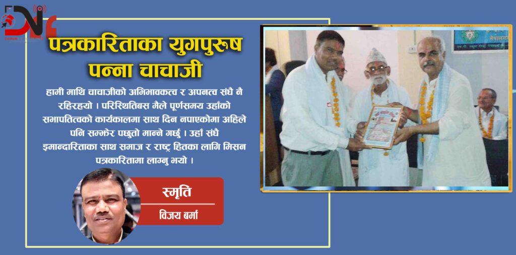 समाजलाई सत्मार्गमा डोर्याउना र नागरिक स्वतन्त्रताको लागि जस्तो सुकै कठिन बाटो अपनाउन परे सधै अग्रसर रहिरहने पत्रकार हुनुहुन्थ्यो पन्नालाल गुप्ता अर्थात् “चाचाजी”जसलाई सही मानेमा समाज को धरोहर भन्नुपर्छ ।