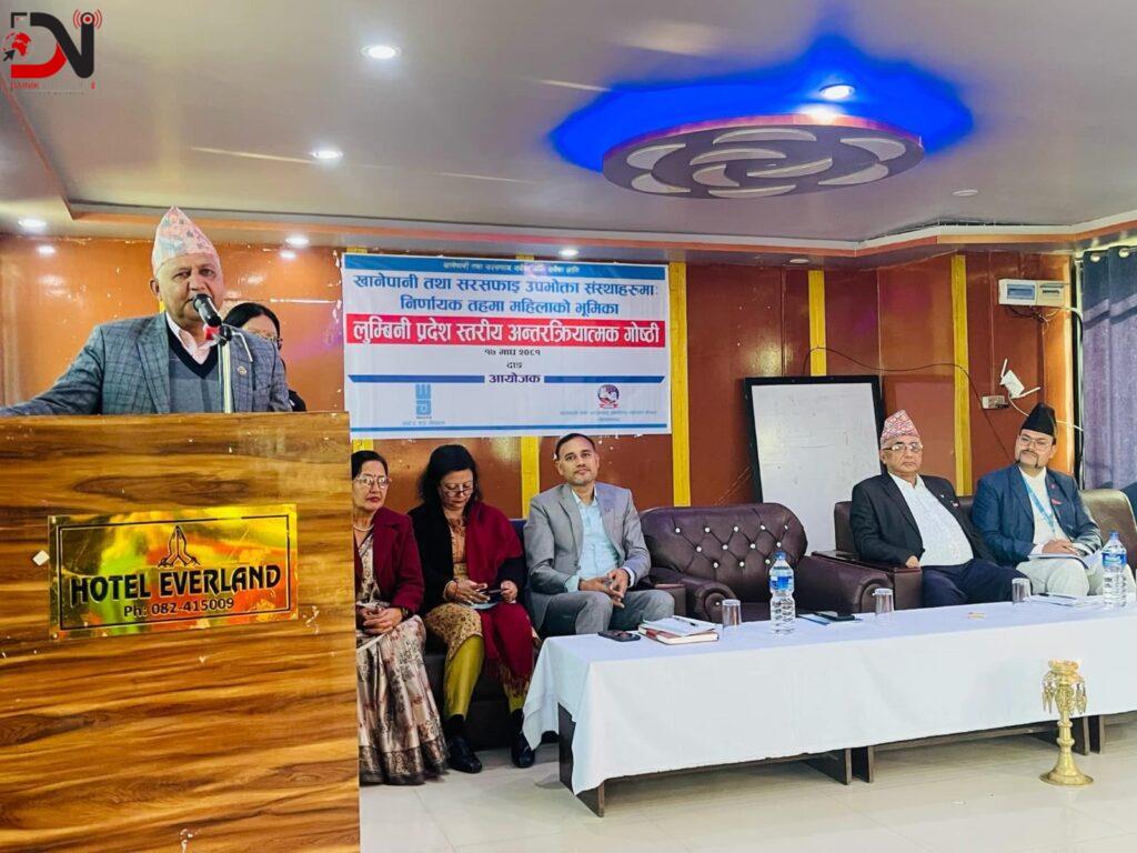 साथै मुख्यमन्त्री आचार्यले खानेपानी उपभोक्ता तथा सरसफाई संस्थामा महिलाको सहभागिता सुनिश्चित भएपनि त्यसलाई अर्थपूर्ण बनाउन भूमिका बढाउनुपर्नेमा जोड दिनुभयो । शहरी क्षेत्रका खानेपानी संस्थामा महिलाको सहभागिता अर्थपूर्ण देखिएपनि ग्रामिण क्षेत्रका संस्थामा सहभागितामा मात्रै रहेको भन्दै उहाँले ग्रामिण क्षेत्रका संस्थाहरुमा पनि सशक्तिकरणको कार्यक्रमलाई प्राथमिकतामा राख्नुपर्ने बताउनु भयो । खानेपानी तथा सरसफाइ उपभोक्ता महासंघ लुम्बिनी प्रदेशका अध्यक्ष थानप्रसाद गैरेको अध्यक्षता तथा मुख्यमन्त्री चेतनारायण आचार्यको प्रमुख आतिथ्यतामा अन्तरक्रिया कार्यक्रमको उद्घाटन गरिएको थियो ।