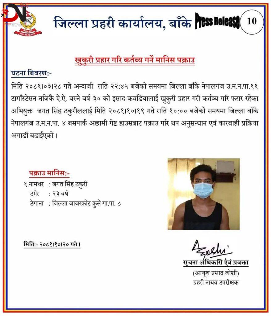 बाँके प्रहरीका अनुसार, नेपालगन्ज ११ टाँगा स्टेशन नजिकै बस्ने इसाद कवडियालाई खुकुरी प्रहार गरी हत्या गर्ने अभियुक्त जगत सिंह ठकुरीलाई प्रहरीले पक्राउ गरेको बाँके प्रहरी प्रवक्ता, प्रहरी नायब उपरीक्षक आयूष प्रसाद जोशीले जानकारी दिए ।