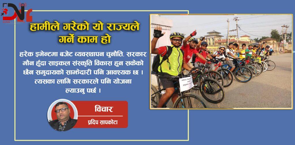 सरकार मौन हुँदा साइकल संस्कृति विकास हुन सकेको छैन । अन्य देशमा वातावरण प्रदुषण, ग्लोबल वार्मिङ लगायतका विषयसँग जोडिएर साइकल प्रवद्र्धन भैरहेको छ । सरकारले साइकल ऐन बनाउनु पर्छ, साइकल लेन बनाउनु पर्छ । साइकललाई सवारी साधनका रुपमा लिनु पर्दछ । तराई क्षेत्रमा सबभन्दा बढी यातायातको साधनका रुपमा लिइने साधन साइकल हो ।
