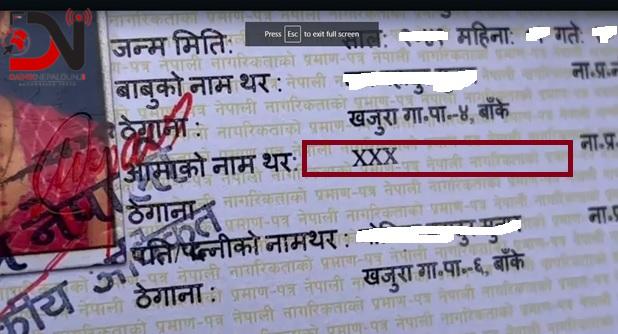 नेपालगन्ज । नेपाली नागरिकताको प्रमाणपत्रमा आमाको नाम उल्लेख गर्न छुट्टै ‘कोलम’ राखिएको छ । तर, बुधबार खजुरा गाउँपालिका वडा नम्बर-६ की राधा सुनारले लिएको नेपाली नागरिकतामा भने आमाको नाम राख्ने कोलम खाली छ । नागरिकतामा बुवाको नाममा मात्र उल्लेख छ । उनी मात्र होइन, जिल्ला प्रशासन कार्यालय बाँकेबाट वितरण हुने अधिकांश नागरिकतामा आमाको नाम उल्लेख गर्न छुटाइएको हुन्छ ।