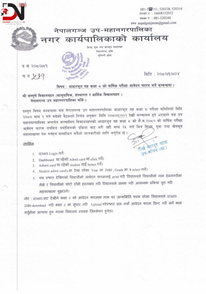 नेपालगन्ज । नेपालगन्ज उपमहानगरपालिकाले आधारभूत तह कक्षा ८ परीक्षाको मिति निर्धारण गरेको छ । शैक्षिकसत्र २०८० को वार्षिक परीक्षा आउँदो चैत २ गतेदेखि सञ्चालन गर्ने निणर्य गरेको हो ।