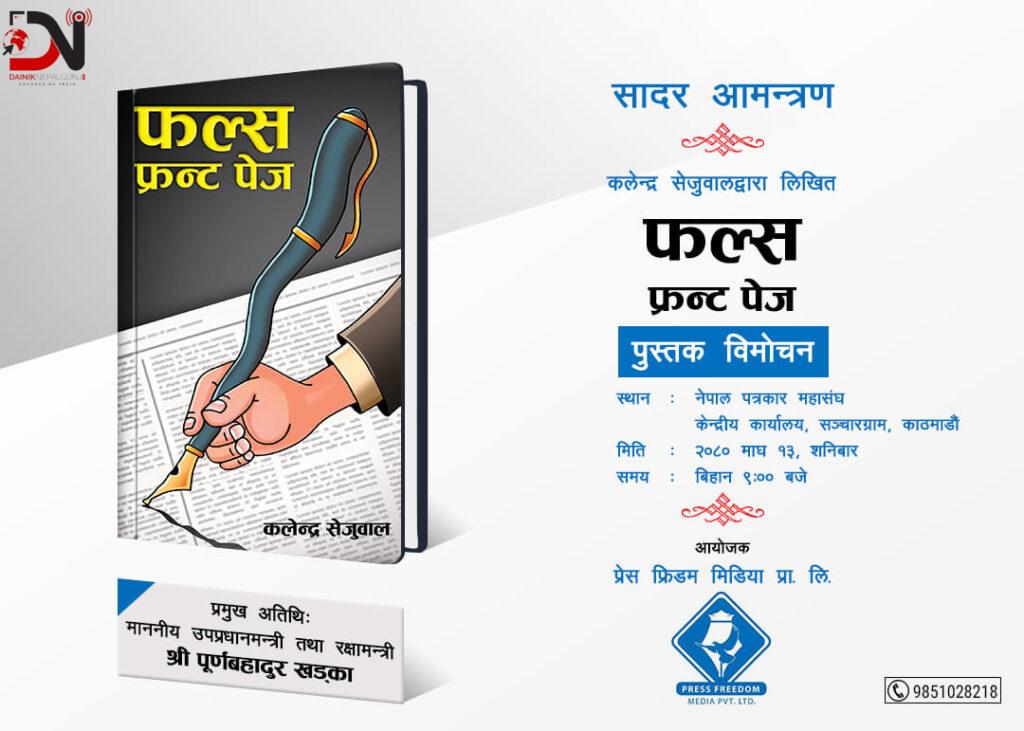 नेपालगन्ज । नेपाल पत्रकार महासंघका केन्द्रीय कोषाध्यक्ष कलेन्द्र सेजुवालद्वारा लिखित ‘फल्स फ्रन्ट पेज’ पुस्तकको विमोचन शनिबार काठमाडौंमा हुने भएको छ । नेपाल पत्रकार महासंघको केन्द्रीय कार्यालय सञ्चारग्राममा उक्त विमोचन हुने भएको छ ।