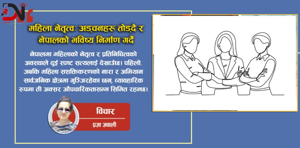 नेपालमा महिलाको नेतृत्व र प्रतिनिधित्वको अवस्थाले दुई स्पष्ट सत्यलाई देखाउँछ। पहिलो, जबकि महिला सशक्तिकरणको नारा र अभियान सार्वजनिक क्षेत्रमा गुञ्जिरहेका छन्, व्यावहारिक रूपमा ती अक्सर औपचारिकतासम्म सिमित रहन्छ। दोस्रो, महिलाहरू सक्षम र योग्य भए पनि उनीहरूले उच्च नेतृत्व स्थानहरूमा पुग्न संघर्ष गर्नु पर्छ। समाजको मानसिकता अझै पनि महिलालाई सहायक भूमिकामा मात्र देख्न चाहन्छ, र जब महिलाहरू नेतृत्वमा आउँछन् भने उनीहरूको क्षमतामा शंका र संकोच गरिन्छ।