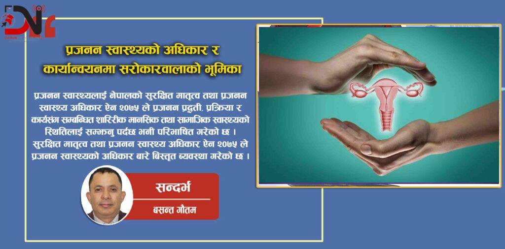 अन्तमा प्रजनन स्वास्थ्यको अधिकार मानव अधिकारकै सवाल भएको र नेपालको संबिधान र कानूनमा प्रजनन स्वास्थ्यको अधिकारलाई सुनिश्चित गरेको सन्दर्भमा देखिएका समस्याहरूको पहिचान गरि प्रभावकारी कार्यान्वयन हुन जरुरी छ । यसका लागी सम्बन्धित निकायले आ¥आफ्नो स्थानबाट प्रभावकारी भुमिका खेल्न आवश्यक छ । (लेखक अधिवक्ता हुन्)