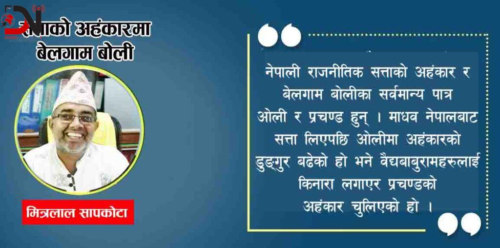 नेपाली राजनीतिक सत्ताको अहंकार र बेलगाम बोलीका सर्वमान्य पात्र ओली र प्रचण्ड हुन् । माधव नेपालबाट सत्ता लिएपछि ओलीमा अहंकारको डुङ्गुर बढेको हो भने वैद्यबाबुरामहरूलाई किनारा लगाएर प्रचण्डको अहंकार चुलिएको हो । यसैले यिनिहरूमा न बोलीको कुनै ठेगान छ न विश्वसनियता नै छ । केहि सण्डमुण्ड र साइबर स्यालहरूको डफ्फा पालिएका छन् । ठेक्कापट्टा कमिशन मिलाइ दिएर मौसमी भजनेहरू पालिएका छन् । नियुक्ति कनेक्शन मिलाएर मञ्च चढाइएका केहि बुद्धिजिविहरू पालिएका छन् । यस्तै यस्तैका बलमा पार्टीभित्र महागुटको नेता र सत्ता मझेरीको निर्णायकत्व लिएर चौपाल जमाएकाहरूको अहंकार र निषेधको पाराकाष्ठा नै चलिरहेको छ ।