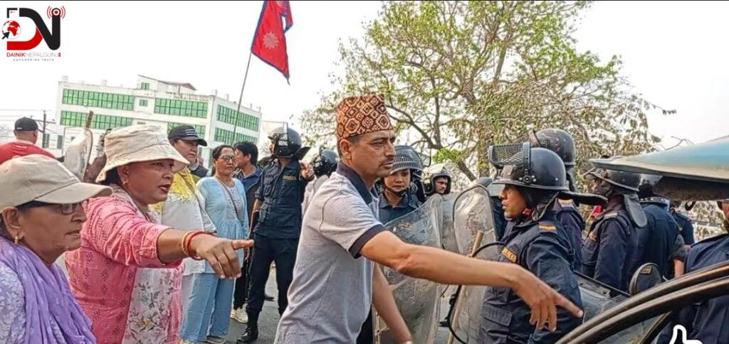 गत चैत्र १५ गते काठमाडौँको तीनकुनेमा प्रदर्शनपछि पक्राउ परेका आफ्ना नेताहरूको रिहाई माग गर्दै सडक अवरुद्ध गर्न प्रदर्शन गरिरहेका हुन्।