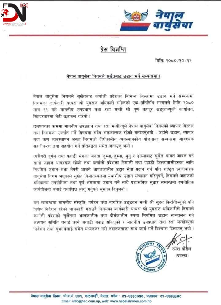 उडान, व्यापार तथा ऋण व्यवस्थापन जस्ता निगमको दीर्घकालीन व्यवस्थापकीय योजनाका सम्बन्धमा आवश्यक सहजीकरण तथा सहयोग गर्ने उनले प्रतिबद्धतासमेत जनाए । त्यसैगरी दुर्गम तथा पहाडी भेगका जनता जुम्ला, हुम्ला, मुगु र डोल्पाबाट सुर्खेत आवतजावत गर्न सानो जहाज आवश्यक रहेको तथा कर्णाली प्रदेशका हिमाली तथा पहाडी जिल्लावासीहरुका लागि नियमित उडान तथा भैपरी आउने आपतकालीन उद्दार सेवा प्रदान गर्न पनि राष्ट्रिय ध्वजावाहक वायुसेवा निगम भएकाले सुर्खेत विमानस्थलमा यथाशीघ्र उडान सञ्चालन गरिनुपर्ने, निगमले जहाजको अधिकतम उपयोगिता तथा पूर्ण क्षमतामा उडान गर्ने साथै प्रशासनिक सुधार सम्बन्धमा रणनीतिक कार्ययोजना बनाई यथाशिघ्र लागु गर्नुपर्ने सुझाव पनि दिए । निगमका कार्यकारी अध्यक्ष अधिकारीले निगमले कर्णाली प्रदेशको सुर्खेतमा अल्पकालीन तथा दीर्घकालीनरुपमा नियमित उडान सञ्चालन गर्ने अध्ययन समिति बनाई कार्य अगाडि बढाएको जनाए ।