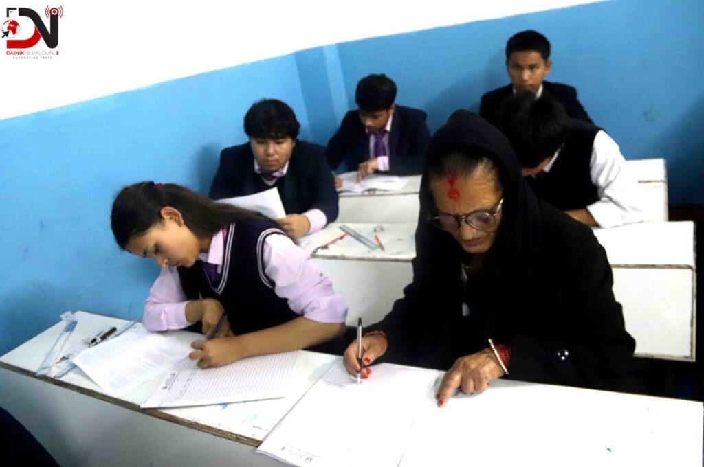 यसैबीच, काठमाडौँ तारकेश्वर नगरपालिका–१० स्थित मनमैजुस्थित एन्जल्स हार्ट सेकेन्डरी स्कुलको परीक्षा केन्द्रबाट ७३ वर्षीय सूर्यवती खनालले परीक्षा दिनुभएको छ । उहाँ तारकेश्वर–११ स्थित ग्रामीण आदर्श बहुमुखी क्याम्पसका विद्यार्थी हुनुहुन्छ ।