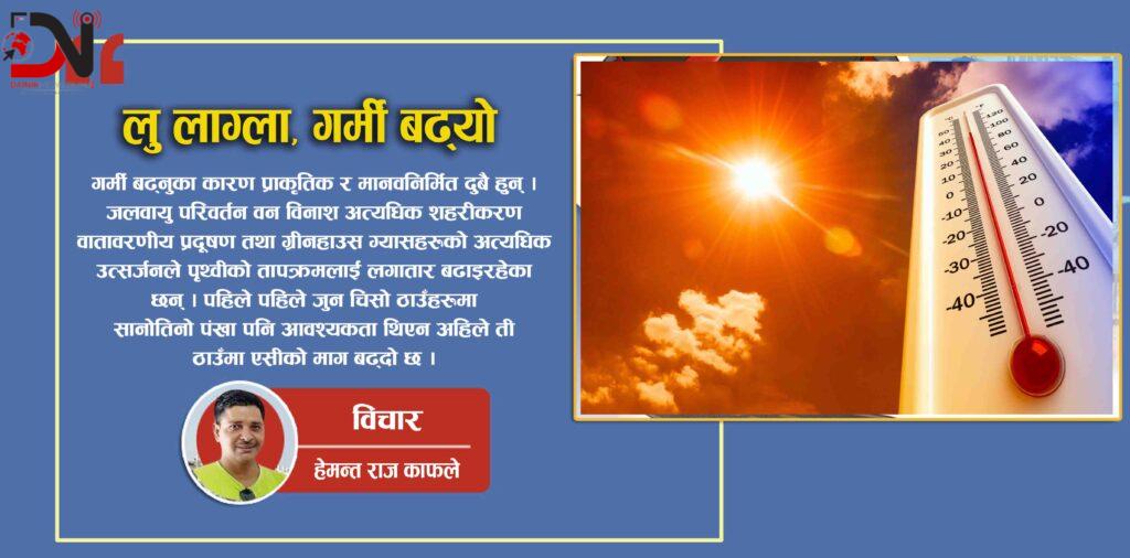 लु लाग्ला गर्मी बढ्यो भन्ने चेतावनी अब केवल सामान्य अभिव्यक्ति मात्र रहेन यो एक गम्भीर संकेत हो हामीले प्रकृतिसँग खेलबाड गर्दा आज दिन प्रतिदिन दुख पाउदै गएका छौ । आजको गर्मी केवल एक ऋतुको तापक्रम मात्र होइन, यो हाम्रो भविष्यप्रतिको चेतावनी हो ।