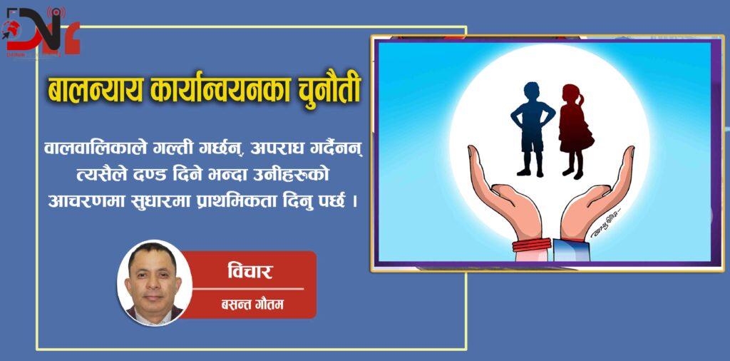 बालन्याय कार्यान्वयनमा अहिले पनि बिभिन्न समस्याहरु देखिने गरेका छन् । ऐन नियममा भएका व्यवस्थाको प्रभावकारी कार्यान्वयनको अभाव, बालन्याय प्रशासनका सरोकारहरुमा सम्वेदनशीलताको अभाव, कतिपय सरोकारवालामा बालन्यायका प्रावधानको ज्ञानको अभाव, तालीमको अभाव, कानून विपरीत कार्य गर्ने बालबालिकलाई हेर्ने सामाजिक दृष्टिकोणमा परिवर्तन हुन नसक्नु बालन्यायका कार्यान्वयनका चुनौती हुन । यस्तै बालसुधार गृह मापदण्ड बमोजिम संचालन हुन नसक्दा कानूनी बिवादमा परेका बालकहरु सुधार गर्ने तर्फ नभई त्यहाँ हुने अवाच्छित क्रियाकलापका कारण बिगार गृह जस्तो भएको छ । त्यस्तो कुरा तुरुन्त सरोकारवालाको ध्यान जान जरुरी छ । अपराधीको प्रकृती र उमेर समुह अनुसार छुटै राख्ने ब्यवस्था, सुधारका पुर्वाधार शिक्षा, स्वास्थ्य, मनोरञ्जन अतिरिक्त क्रियाकलाप लगायतको समुचित ब्यवस्थापन हुन जरुरी छ ।