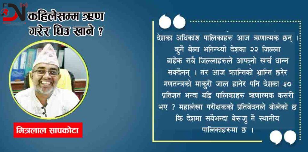 देशका अधिकाशं पालिकाहरू आज ऋणात्मक छन् । कुनै बेला भनिन्थ्यो देशका २२ जिल्ला बाहेक सबै जिल्लाहरूले आफ्नो खर्च धान्न सक्दैनन् । तर आज क्रान्तिको भ्रान्ति छरेर गणतन्त्रको माकुरी जाल हानेर पनि देशका ५० प्रतिशत भन्दा बढि पालिकाहरू ऋणात्मक कसरी भए ? महालेखा परीक्षकको प्रतिवेदनले बोलेको छ कि देशमा सबैभन्दा बेरुजु नै स्थानीय पालिकाहरूमा छ । गत आर्थिक बर्षमा मात्रै ९१ अर्ब भन्दा माथि बेरुजु भएको छ । यसमा ५० प्रतिशत भन्दा बढि त स्थानीय पालिकाहरूमा नै भएको छ । भ्रष्टाचारलाई वैधानिक बनाउन आफै कानून बनाएर अनेक ढाकछोप गर्दा पनि यतिसारो बेरुजु कसरी आयो ? के यो सब त्यहि ऋण गरेर घिउ खाने नीतिका कारण आएको होइन र ?