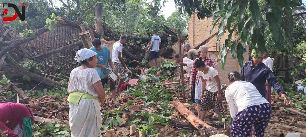 नेउलापुर गाउँका रामकुमार थारुको घरमाथि घर नजिकै रहेको सालकाे रुख ढल्दा पुर्ण रुपमा घर क्षति भएको छ भने उहाँका छोराहरु ५ वर्षका आदित्य थारु र १० वर्षका अमित थारु घाइते भएका छन् ।