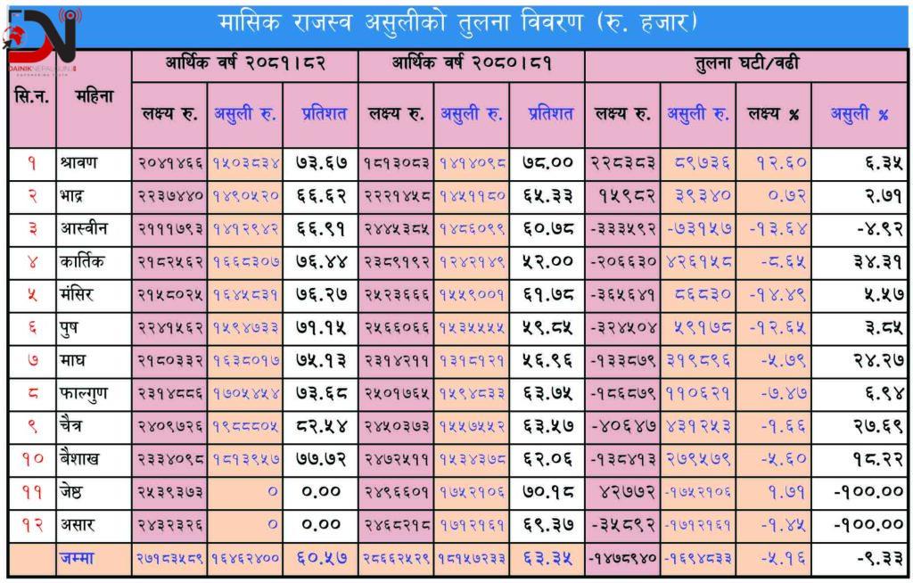 चालु आर्थिक बर्ष २०८१÷०८२ को साउनदेखि हालसम्म कुनै पनि महिना नेपालगन्ज भन्सारले मासिक लक्ष्य अनुसार राजश्व संकलन गर्न सकेको छैन । यद्यपि, चैत्र महिनामा भने भन्सारले लक्ष्यको ८२.५४ प्रतिशत भन्सार राजश्व संकलन गरेकोमा अन्य महिना ८० प्रतिशत लक्ष्य नाघेको तथ्यांक रहेको छ ।