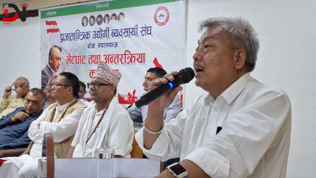 प्रजातान्त्रिक उद्योगी व्यवसायी संघ बाँके नेपालगंजले आयोजना गरेको नेपाली कांग्रेसका महामन्त्री गगन कुमार थापासँगको भेटघाट तथा अन्तक्रिया कार्यक्रममा नेपाल सरकारले आर्थिक क्रियाकलापको नाममा व्यवसायीहरुको घाटी निचोड्ने काम गरेको बताएका छन ।
