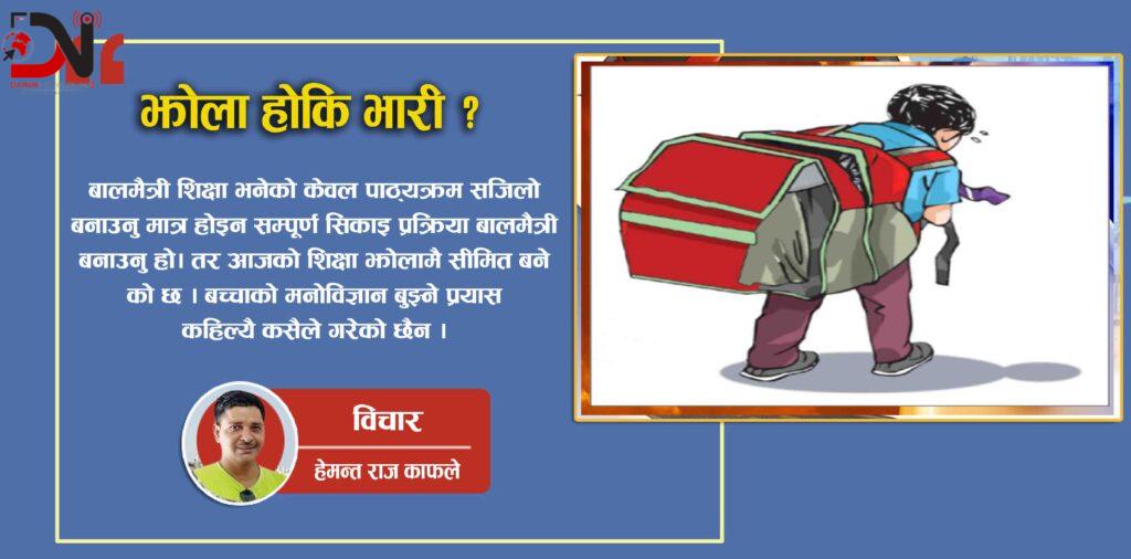 हाम्रो समाजले बालबालिकाको उज्ज्वल भविष्य निर्माण गर्न शिक्षालाई निकै महत्त्व दिएको छ । विद्यालयहरू शिक्षकहरू अभिभावकहरू र सरकारले बालबालिकाको शिक्षा र विकासमा लगानी विभिन्न प्रयासहरू गरिरहेका छन् । तर यस्तो लगानीको मूल प्रश्न हो के यो प्रक्रिया बालमैत्री छ ? के हामीले उनीहरूलाई रमाइलो सहज सिर्जनशील वातावरण दिन सकिरहेका छौँ? अहिलेको वास्तविकता हेर्दा देखिन्छ बिहान सबेरै उठ्ने ठूला झोला बोकेर स्कूल पुग्ने बालबालिकाको दैनिकीले बाल्यकाल नै तनावमा बिती रहेको हुन्छ । त्यो झोला किताब कापी र टिफिन बोक्न बनाइएको भए तापनि, वास्तविकतामा त्यो झोला उनीहरूको स्वतन्त्रता रमाइलो भावनात्मक स्वास्थ्यमाथिको बोझ बनेको छ । यति सानो उमेरमा भारी बोझ बोकाउनु न त शारीरिक विकासको दृष्टिकोणले उपयुक्त छ न त मनोवैज्ञानिक दृष्टिले न्यायोचित छ ।